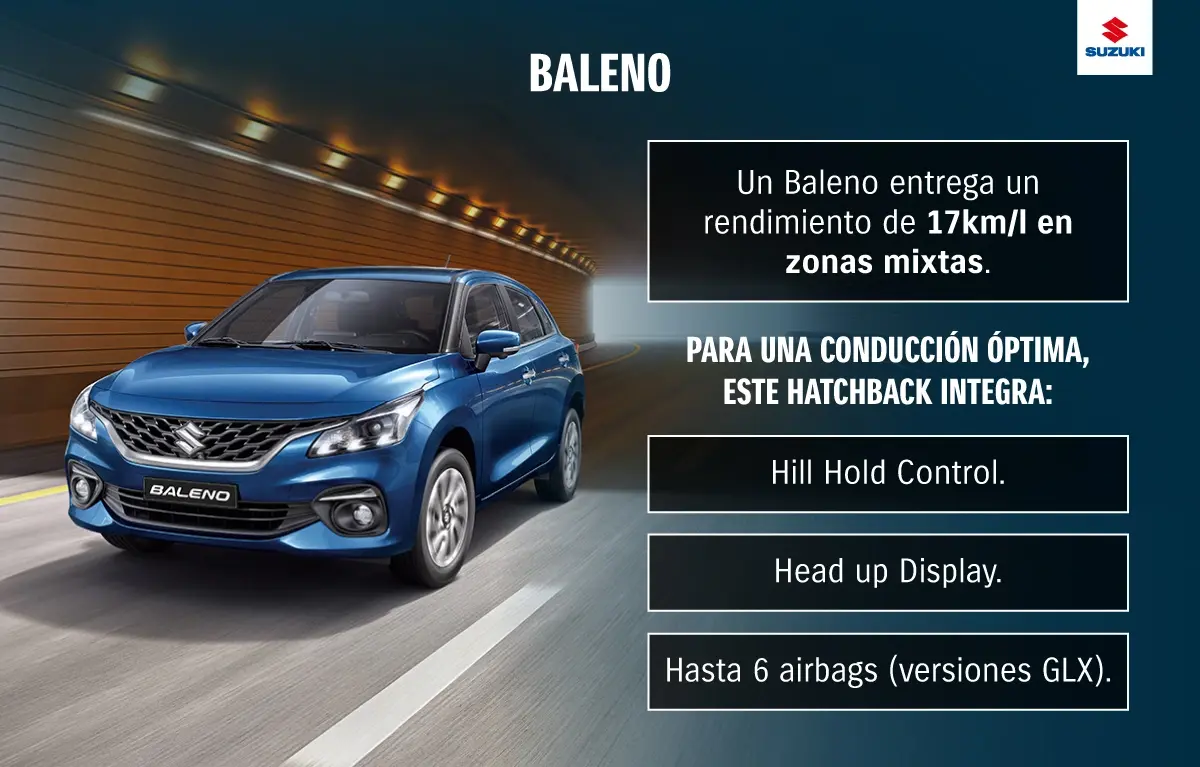 Ya sea para recorrer dÃa a dÃa la ciudad o vivir aventuras durante los fines de semana, la eficiencia de Baleno no decepcionará. En condiciones mixtas, este ejemplar ofrece un rendimiento de un poco más de 17 km/l. Por ende, se convierte en un gran compañero en múltiples escenarios.