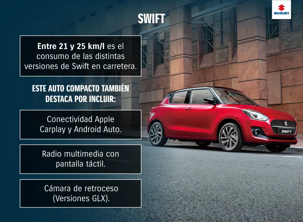 Swift tampoco se queda atrás en tecnologÃa. Incorpora el sistema Heartect , que permite un mejor desempeño al conducir, incrementa la seguridad y optimiza la eficiencia en el uso de combustible. Entre otros componentes, también integra radio multimedia con conectividad para Apple CarPlay y Android Auto, además de cámara de retroceso para versiones GLX .