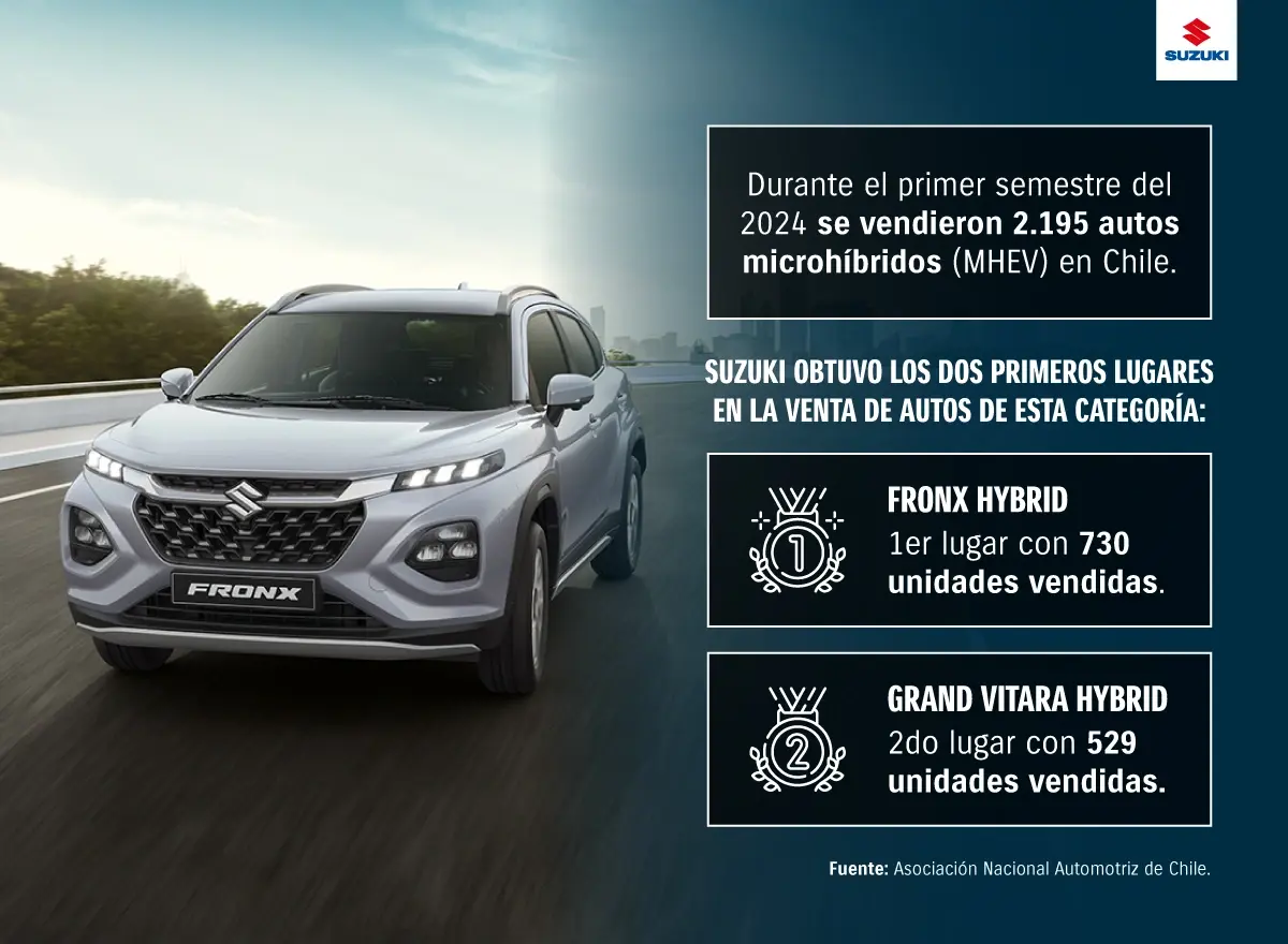En el mismo informe, Suzuki destacó al obtener el primer y segundo lugar en ventas , con sus modelos microhÃbridos Fronx Hybrid y Grand Vitara Hybrid liderando el ranking de la sección mild hybrid en Chile.